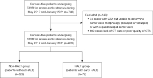 The data supporting the findings of this study are available from the corresponding author upon reasonable request. This study was conducted as a single-center investigation at West China Hospital, Sichuan University. We consecutively enrolled patients with severe aortic stenosis who underwent TAVR at West China Hospital between May 2012 and January 2021. The main exclusion criteria were the following: (I) previous temporary prophylactic oral anticoagulant therapy without indications for anticoagulation; (II) valve problems due to infective endocarditis; (III) absence of preprocedural computed tomography (CT) imaging for determining the aortic valve type, including quadricuspid valve; (IV) previous bioprosthetic valve implantation before TAVR; (V) contraindications to contrast agents, allergies, or severe renal dysfunction (estimated glomerular filtration rate ≤30 mL/min); and (VI) incomplete or inconclusive CT series. The indication for TAVR was discussed in all cases by our multidisciplinary heart team according to the established clinical guidelines. A dedicated, predefined database was used to prospectively collect baseline demographics, clinical and anatomical features, procedural details, and hospitalization events. In the CT analysis, valve subtypes were classified, and the identification and determination of HALT was performed by experienced imaging specialists. Follow‐up with transthoracic echocardiography was systematically carried out at discharge, 1 month, 6 months, and 1 year, and then annually thereafter. The methodologies used for TAVR were in accordance with those previously described (13). The transcatheter heart valves (THVs) used during the study period were primarily self-expanding valves, including the VenusA-Valve (Venus MedTech, Hangzhou, China), CoreValve/Evolut Pro (Medtronic, Minneapolis, MN, USA), TaurusOne (Peijia Medical, Suzhou, China), and VitaFlow (MicroPort CardioFlow, Shanghai, China). The study was conducted in accordance with the Declaration of Helsinki and its subsequent amendments. The study was approved by the Ethics Committee on Biomedical Research, West China Hospital of Sichuan University [No. 2021(824)]. All participants provided written informed consent.