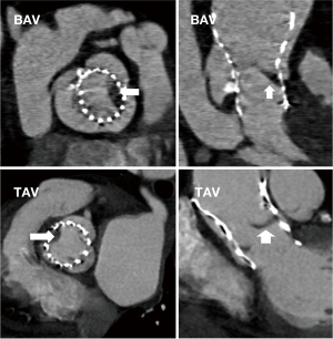 Early hypoattenuated leaflet thickening (HALT) diagnosed by computed tomography angiography (CTA) occurs in at least 10% of patients after TAVR (6-8). Studies have demonstrated that HALT is associated with an increased incidence of cerebral ischemic lesions observed on magnetic resonance imaging (MRI) (9), symptomatic hemodynamic deterioration (10) and adverse clinical outcomes (11). Additionally, due to the effectiveness of pharmacological intervention with anticoagulation, HALT has aroused considerable interest (7). Therefore, proactive identification of HALT and targeted interventions are essential to mitigating its effect on patient outcomes and valve durability. Although previous studies have reported that the incidence of HALT after TAVR in patients with BAV is comparable to that in patients with TAV (12), the specific contributing factors remain incompletely understood.