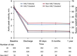 Table 4 presents the clinical outcomes and hemodynamics parameters at 30 days and 1 year for patients with and without HALT. In the follow-up period, in-hospital HALT, as compared to no HALT, was not associated with 30-day mortality (n=1, 1.2%; n=8, 1.5%; P=0.86) or 1-year mortality (n=1, 1.2%; n=13, 2.5%; P=0.50). At 30 days, the HALT group, as compared to the non-HALT group, had a significantly lower aortic valve velocity (2.17±0.44 vs. 2.44±0.50 m/s; P<0.001) and mean transprosthetic pressure gradient (11.36±4.38 vs. 13.94±5.86 mmHg; P<0.001); at 1 year, the HALT group still had a lower aortic valve velocity (2.20±0.50 vs. 2.36±0.54 m/s; P=0.07) and mean transprosthetic gradient (11.36±6.06 vs. 13.02±6.84 mmHg; P=0.14), and there was no significant hemodynamic deterioration in either group during this period (Figure 3).