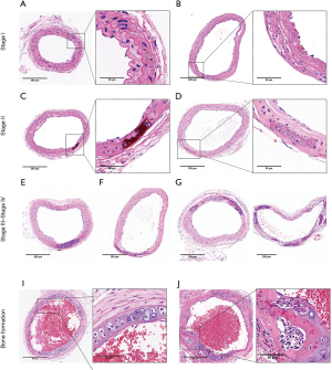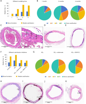 When the modeling time (1, 2, 3, and 4 months) was reached, the length of 4–5 mm injury sites in the LCA was extracted. The blood vessel samples were fixed with paraformaldehyde for H&E and Von Kossa staining. None of the tissue sections underwent decalcification. All stained samples were scanned with a panoramic digital scanner (KF-PRO-120-HI, Jiangfeng Bio, Shanghai, China) using the manufacturer’s accompanying KF-PRO-SCAN software (version 1.7.1.1), and photographed with a 40× objective lens. Analysis of the images was performed with the corresponding digital imaging software. All the samples were numbered, and the pathologist performed a blinded analysis of the results, and their evaluations were averaged to determine the final grade for each sample.