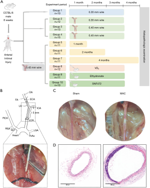 Vascular calcification, particularly MAC, is increasingly recognized as a process resembling endochondral ossification. This pathological transition is primarily driven by chondrocyte-like differentiation of vascular smooth muscle cells (VSMCs), rather than direct osteoblast-like transformation. Under stimuli such as inflammation, oxidative stress, or shear pressure, VSMCs undergo phenotypic switching toward a chondrogenic lineage, characterized by expression of SRY-box transcription factor 9 (Sox9) and secretion of cartilage-specific extracellular matrix proteins such as type II collagen and aggrecan. This cartilage-like template subsequently becomes mineralized, leading to vessel wall calcification (10,11). This mechanism has been consistently observed in both experimental models and human studies of MAC. The mouse carotid artery wire injury model is a well-established tool for studying endothelial regeneration (12). While severe endothelial dysfunction is a known precursor to vascular calcification, reliably modeling MAC has remained challenging. Driven by our initial serendipitous observation that varying the degree of mechanical injury (by adjusting guidewire diameter and friction) could induce varying degrees of vascular calcification, we sought to systematically optimize the model. We then rigorously evaluated key parameters—including guidewire diameter, the timing of calcification development, and the role of VD3 supplementation—to establish a definitive and optimal protocol for inducing MAC in C57BL/6J mice. Using this model, we not only preliminarily established the pathogenic standards for MAC but also examined its response to a calcification inhibitor, thereby validating its utility for therapeutic screening. We present this article in accordance with the ARRIVE reporting checklist (available at https://cdt.amegroups.com/article/view/10.21037/cdt-2025-435/rc).