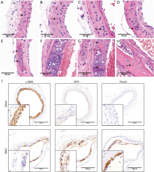 Histological examination revealed that VSMCs in the experimental group underwent activation, proliferation, and migration into the intima, where they differentiated into cells exhibiting a chondroid morphology, with small cell volumes, scattered within the CCA (Figure 2A-2C). These cells further proliferated and were associated with the deposition of a basophilic, cartilage-like matrix (Figure 2D,2E). A subset of these cells hypertrophied and formed homogeneous cell clusters, resembling those seen in hyaline cartilage (Figure 2F), while other areas exhibited features indicative of osteogenic differentiation (Figure 2G,2H). IF analysis confirmed the osteogenic transdifferentiation of VSMCs in calcified vessels. This was evidenced by the molecular signature: decreased expression of the contractile marker α-SMA, alongside increased expression of the osteogenic regulators Runx2 and OPN (Figure 2I). This Runx2+/OPN+/α-SMA− profile directly demonstrates that VSMCs switched from a contractile to a bone-forming phenotype, which is consistent with the observed histological progression from chondrogenic differentiation to overt calcification (Figure 2B-2H).
