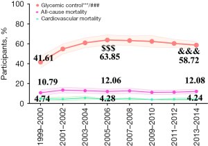 Therefore, this study had two primary objectives: (I) to analyze temporal trends in the proportion of U.S. adults with diabetes achieving HbA1c <7.0% between 1999 and 2014, as well as the trends in all-cause and cardiovascular mortality risks among this population; and (II) to assess the association between achieving HbA1c <7.0% and 5-year risks of cardiovascular and all-cause mortality. In addition, we explored potential cause underlying these associations. We present this article in accordance with the STROBE reporting checklist (available at https://cdt.amegroups.com/article/view/10.21037/cdt-2025-59/rc).