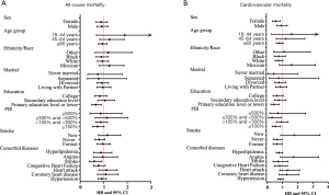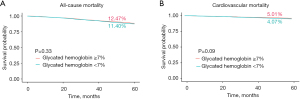 The median follow-up duration in this study was 60 months, and the mean follow-up duration was 56.15 months. The Kaplan-Meier survival curves showed that the group with HbA1c <7.0% had higher 5-year all-cause mortality (12.47% vs. 11.40%, P=0.33) and cardiovascular mortality (5.01% vs. 4.07%, P=0.09) compared to the group with HbA1c ≥7.0% (Figure 2). Using the group with HbA1c <7.0% as the reference, the HR for all-cause mortality in the HbA1c ≥7.0% group, adjusted for sex, age, and ethnicity/race, was 1.14 (95% CI: 0.94–1.37; P=0.17) (Table 2). After full adjustment in model 3, which included sociodemographic factors, comorbidities, and relevant clinical variables, the association remained nonsignificant (HR: 0.64; 95% CI: 0.36–1.13; P=0.13) (Table 2). For cardiovascular mortality, the HR in the HbA1c ≥7.0% group was 1.03 (95% CI: 0.81–1.30; P=0.82) after adjustment for sex, age, and ethnicity/race. Similarly, after full adjustment, the association remained no significant (HR: 1.11; 95% CI: 0.41–3.02; P=0.84) (Table 2). Comprehensive sensitivity analyses across all predefined demographic and clinical subgroups—including age, sex, duration of diabetes, and comorbidity burden—consistently failed to demonstrate a significant mortality benefit associated with maintaining HbA1c <7.0%, with null findings observed for both all-cause and cardiovascular mortality. Notably, individuals with a primary education level or lower exhibited a decreased risk of all-cause mortality (HR: 0.663; 95% CI: 0.485–0.906; P=0.01) and cardiovascular mortality (HR: 0.494; 95% CI: 0.285–0.857; P=0.01) in the HbA1c ≥7.0% group compared to those with HbA1c <7.0% (Figure 3, Tables S3,S4). Furthermore, HbA1c levels ≥7.0% were associated with a reduced risk of cardiovascular mortality among female patients (HR: 0.609; 95% CI: 0.410–0.906; P=0.01) and individuals with an poverty-to-income ratio (PIR) below 100% (HR: 0.593; 95% CI: 0.378–0.930; P=0.02) relative to those with HbA1c <7.0% (Figure 3, Tables S3,S4).