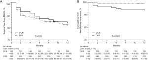 Table 2 summarizes coronary angiography and PCI characteristics of the study participants. Specifically, single-vessel CTO accounted for 80.0%, with CTO located the most commonly in the right coronary artery (42.5%). There was no difference in the proportion of large vessel disease (diameter >2.75 mm) and small vessel disease (diameter ≤2.75 mm) (50.6% vs. 49.4%). The overall Japanese-chronic total occlusion (J-CTO) score was 1.18±1.01, without statistically significant inter-group difference. However, the DES group had a higher proportion of lesions with bending >45°, a feature that increases the technical challenge of stent delivery. Furthermore, compared to the DES group, the DCB group had a higher proportion of CTO in the left circumflex artery, a smaller target vessel diameter, and less contrast volume used during the procedure. Meanwhile, the DCB group exhibited significantly fewer devices, shorter total deployed length, and smaller mean nominal device diameter compared to the DES group. In addition, no statistically significant inter-group differences was found in terms of artery approach, CTO wire number, proportion of bilateral angiography, IVUS utilization rate, as well as the proportions of fibrous, calcified, and lipid plaques assessed by IVUS.