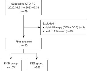 This was a single-center, retrospective, observational cohort study. A total of 479 consecutive patients who underwent successful CTO-PCI at the First Affiliated Hospital of Dalian Medical University from March 31, 2020 to March 31, 2023 were enrolled. The exclusion criteria were: (I) acute ST-segment elevation myocardial infarction (MI); (II) prior coronary artery bypass grafting (CABG); (III) hybrid strategy using both DES and DCB after CTO recanalization; and (IV) lost to follow-up. 9 patients who underwent hybrid treatment with both DES and DCB and 25 patients lost to follow-up were excluded, and 445 patients were included in this study. Patients were assigned to either the DES group or the DCB group according to the device used during the procedure. The patient selection flowchart is shown in Figure 1. This study was conducted in accordance with the Declaration of Helsinki and its subsequent amendments. The study was approved by the Ethics Committee of the First Affiliated Hospital of Dalian Medical University (approval No. PJ-KS-KY-2025-396). The requirement for informed consent was waived due to its retrospective design, the use of fully de-identified clinical data, and because the waiver did not adversely affect the rights and welfare of the participants.