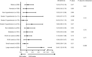 A significant interaction existed between treatment strategy (DCB/DES) and vessel size, as presented in Figure 3. Patients who underwent large-vessel CTO-PCI (>2.75 mm) with DCB demonstrated a significantly lower incidence of MACE compared to those treated with DES. However, this difference was not observed in small-vessel CTO-PCI (≤2.75 mm). Besides, there were no significant interactions between treatment strategy and other subgroup variables (gender, hypertension grade, diabetes, or IVUS utilization). Kaplan-Meier survival curve for MACE in large-vessel group is presented in Figure 4, and the forest plot is shown in Figure 3.