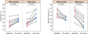 As shown in Tables 2,3 and Table S2, at the 30-week follow-up, both the myectomy group and the mavacamten group showed significant improvements in LV structure, function, myocardial deformation, and LV flow components.