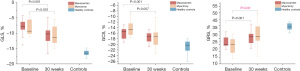 Compared to baseline, all strain parameters significantly improved at week 30 in both HOCM patient groups: mavacamten group: GLS: −8.02%±2.92% vs. −10.56%±3.06%, P=0.001; global circumferential strain (GCS): −16.00%±2.04% vs. −17.46%±1.84%, P<0.001; global radial strain (GRS): 27.02%±4.85% vs. 30.36%±5.46%, P=0.001; myectomy group: GLS: −8.07%±2.66% vs. −10.84%±3.02%, P<0.001; GCS: −14.31%±2.70% vs. −17.63%±3.67%, P=0.007; GRS: 24.71%±6.37% vs. 33.12%±9.28%, P=0.01, as shown in Figure 3.