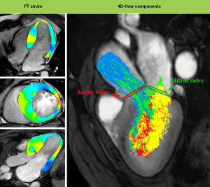 In healthy individuals, myocardial cells within the ventricular walls are arranged in an ordered, laminar fashion along different directions, enveloping the ventricles. This unique architecture allows the various muscle fiber layers to interact in a highly coordinated manner, generating synergistic contraction that produces the left ventricular (LV) hemodynamics necessary to maintain effective circulation (10). Cardiac magnetic resonance (CMR) imaging, as a non-invasive, high-resolution examination method, can simultaneously assess the myocardial detailed structure, function, and intraventricular hemodynamics (11). On one hand, CMR feature tracking (CMR-FT) analysis can non-invasively and quantitatively evaluate myocardial deformation in different spatial directions, which cannot be distinguished by LV ejection fraction (LVEF) alone. Particularly, the subtle changes in global longitudinal strain (GLS) in HOCM patients after pharmacotherapy or surgery reveal the treatment-induced improvements in myocardial mechanical function, and its prognostic value has been established in hypertrophic cardiomyopathy (HCM) (12,13). On the other hand, four-dimensional flow (4D-flow) technology enables a comprehensive assessment of intraventricular hemodynamics. This imaging technique can semi-automatically provide three-dimensional quantification of the inflow and outflow proportions within the LV cavity at different time points in the cardiac cycle. Furthermore, growing evidence supports the role of 4D-flow CMR in detecting subtle hemodynamic abnormalities across various cardiovascular diseases (14-16).