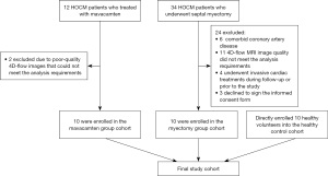 Finally, a total of 56 subjects were initially identified. After applying the inclusion and exclusion criteria, 30 subjects were finally enrolled for analysis. They were divided into three groups: 10 HOCM patients treated with mavacamten, 10 HOCM patients who underwent septal myectomy, and 10 healthy volunteers without a history of heart disease or cardiovascular risk factors (as shown in Figure 1). The specific reasons for exclusion during screening were as follows: (I) comorbid coronary artery disease (myectomy group: n=6); (II) invasive cardiac treatments during follow-up or prior to the study (myectomy group: n=4); (III) 4D-flow image quality insufficient for analysis (myectomy group: n=6; mavacamten group: n=2); (IV) observation of LV dysfunction (LVEF <50%) requiring discontinuation of treatment within 30 weeks of starting treatment in the mavacamten group (n=0); and (V) explicitly declined to sign the informed consent form for this study (myectomy group: n=3).