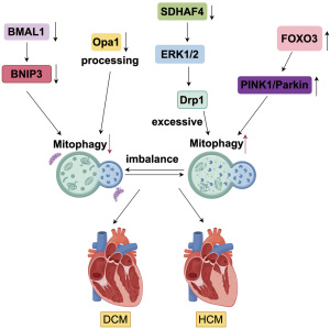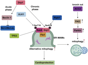 STX17-CDK1-Drp1 axis: Syntaxin 17 (STX17), a SNARE scaffold protein located at mitochondria-associated membranes (MAMs), serves as a molecular platform for the recruitment of Drp1 during mitochondrial fission. Both human HF and transverse aortic constriction–induced mouse models exhibit significantly reduced STX17 expression, accompanied by impaired mitophagy and mitochondrial fragmentation. Mechanistically, STX17 recruits CDK1 to MAMs, facilitating Drp1 phosphorylation at Ser616, thereby promoting mitophagy and MQC. STX17 overexpression rescues cardiac dysfunction, indicating its essential role in mitochondrial homeostasis (25).