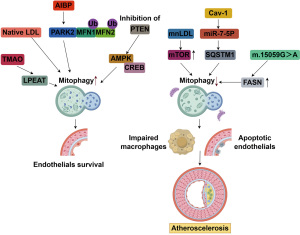 Differential effects of LDL and multiply modified low-density lipoprotein (mmLDL) on mitophagy: low-density lipoprotein (LDL) is a key initiator of AS, but its modified forms exert distinct effects on mitophagy. Bezsonov et al. (41) demonstrated that native LDL enhances mitophagy in both THP-1 and TCN521 cells, whereas mmLDL inhibits mitophagy in THP-1 macrophages but enhances it in TCN521 cells. This inhibition may occur through the activation of the mTOR pathway, suggesting that mmLDL suppresses mitophagy and contributes to mitochondrial dysfunction and plaque development. Additionally, variations in mtDNA genotypes may modulate this response, indicating a genetic basis for mitophagy heterogeneity in AS.