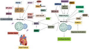 HF represents the terminal stage of multiple CVDs, and is associated with high morbidity and mortality (24). A central hallmark of the pathogenesis of HF is mitochondrial dysfunction, leading to impaired myocardial energy production and contractile failure. Recent studies have identified diverse molecular regulators and signaling cascades governing mitophagy during cardiac stress, providing novel insights into the pathophysiological mechanisms of HF and potential therapeutic avenues for mitochondrial-targeted interventions (Table 3 and Figure 2).