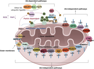 ATG, autophagy-related gene; CCCP, carbonyl cyanide 3-chlorophenylhydrazone; GABARAP, GABA type A receptor-associated protein; LIR, LC3-interacting region; mtDNA, mitochondrial DNA; N/A, not available; OMM, outer mitochondrial membrane; ROS, reactive oxygen species.cardiovascular diseases