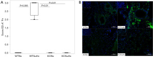 Re-expression of ED-A+ Fn in lung tissue (Figure 6) was assessed by immunofluorescence staining using the F8 antibody specific for ED-A+ Fn. PH induction in the SuHx mouse model led to significant re-expression and pronounced vascular and interstitial deposition of ED-A+ Fn in the WTSuHx group (2.75±0,43; Figure 6B), that was significantly higher compared to WTNx (0±0, P=0.006), KONx (0±0, P=0.01) and KOSuHx (0±0, P=0.01) groups (Figure 6A). KO groups lacking the ability to produce ED-A+ Fn did not show any re-expression of the target molecule under either normoxic or SuHx conditions.