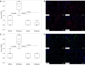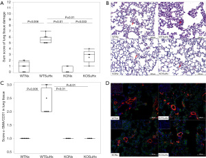To further assess the extent of media hypertrophy and PH-induced endothelial dysfunction, double immunofluorescence staining of α-SMA and the endothelial cell marker CD31 was performed (Figure 4D). WTSuHx mice (2.31±0.43) exhibited significantly increased α-SMA expression and disruption of the endothelial cell layer in pulmonary vessels, indicated by discontinuous CD31 staining, compared to WTNx (1±0, P=0.006), KONx (1±0, P=0.01), and KOSuHx (1±0, P=0.01). No significant differences were observed between KONx and KOSuHx mice (P=n.s.; Figure 4C).