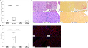 RV myocardial tissue was evaluated assessing interstitial cellularity, particularly the infiltration of inflammatory cells, and the extent of interstitial fibrosis. Both parameters were assessed semi-quantitatively on a scale from 0 to 3 (0: not detectable, 1: mild, 2: moderate, 3: severe). The total score for RV tissue damage ranged from 0 to 6 points, with higher scores indicating more severe tissue damage.