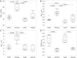 TTE was carried out on day 28 p.i. on all animals. Significant alterations in echocardiographic parameters were observed in the WTSuHx group relative to all other groups. Basal RV diameter (RVbasal) was significantly increased in WTSuHx mice (2.6±0.2 mm) compared to normoxic WTNx (2.1±0.1 mm, P=0.006), normoxic KONx (1.9±0.1 mm, P=0.01), and SuHx-induced KOSuHx (2.1±0.2 mm, P=0.01) mice (Figure 3B). SuHx-induced KO mice (2.14±0.19 mm) showed a trend towards smaller RVbasal compared to WTSuHx (2.57±0.15 mm), but no significant structural changes were observed within the KO groups after PH induction (P=n.s.). For RAarea (Figure 3C), WTSuHx mice (7.8±1.2 mm2) exhibited a significant increase compared to normoxic WTNx (4.3±0.5 mm2, P=0.006) and KONx (4.1±0.7 mm2, P=0.03), while KOSuHx mice (4±0.9 mm2) did not differ significantly from normoxic WT or KO controls (P=n.s.).
