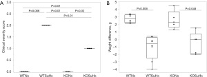 All animals were healthy at baseline (CSS 0 on day 1). Around day 10 p.i., SuHx-induced mice showed clinical deterioration, manifested as reduced activity, particularly in WTSuHx mice (CSS 2 on day 28) compared to KOSuHx (CSS 1 on day 28) and normoxic controls (CSS 0 on day 28 for WTNx and KONx; Figure 2A). Body weight changes from day 1 to 28 differed significantly between groups (Figure 2B and Figure S1). While normoxic WT (2.78±0.49 g) and KO animals (2.6±1.08 g) gained weight, SuHx-induced WT mice tended to lose weight (−1.08±1.5 g).