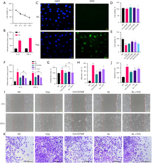 CCK-8 assays indicated that TZTMF-containing serum at concentrations of 5%, 10%, 15%, and 20% did not exhibit cytotoxicity toward MOVAS cells relative to the NC group (Figure 4D). Under hypoxic conditions, cell viability decreased to 52.13%±1.95%, whereas treatment with 10% and 15% TZTMF-containing serum significantly increased viability to 78.94%±3.60% and 76.37%±6.78%, respectively (Figure 4E), leading to the selection of 10% for subsequent assays. Experimental groups were defined as follows: NC (normoxia with 10% blank serum), hypoxia (Hyp; 12 h hypoxia with 10% blank serum), hypoxia + 10% TZTMF (Hyp + TZTMF), itacitinib (Ita; hypoxia with 1 µM JAK1 inhibitor and 10% blank serum), and itacitinib + 10% TZTMF (Ita + TZTMF).