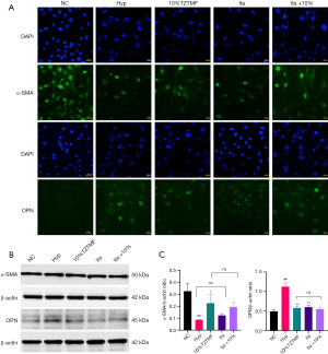 Under normal conditions, α-SMA is highly expressed in contractile VSMCs, whereas OPN is minimally expressed. Adverse stimuli such as hypoxia and oxidative stress alter this expression pattern (51). Elevated OPN levels correlate with AS severity and increased risk of major adverse cardiac events, and OPN has been demonstrated to promote foam cell formation by inhibiting cholesterol efflux in VSMCs (52,53). PDGF-BB promotes VSMC proliferation and migration while reducing α-SMA and SM22α expression, whereas atorvastatin preserves the contractile phenotype (54). In ovariectomized ApoE−/− mice fed a HFD, α-SMA expression is reduced and OPN elevated, but administration of Liuwei Dihuang soft capsules attenuated AS and inhibited VSMC phenotypic switching (55). Consistently, the current study demonstrated that TZTMF modulated α-SMA and OPN expression in the aortas of ApoE−/− mice (Figure 3D,3E), and 10% TZTMF-treated serum increased α-SMA while reducing OPN levels in hypoxia-induced MOVAS cells, as confirmed by immunofluorescence (Figure 5A-5C).
