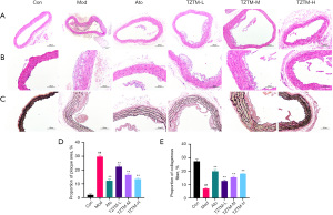 The AS model was established by feeding ApoE−/− mice a high-fat diet (HFD; 0.2% cholesterol, 25% anhydrous milk fat, and 74.8% normal diet) for 16 consecutive weeks. After one week of HFD feeding, mice received either TZTMF or distilled water via intragastric administration for 15 weeks and were randomly assigned to six groups (n=12 per group): (I) control group (Con; C57BL/6J mice, normal diet); (II) model group (Mod; ApoE−/− mice, HFD); (III) high-dose TZTMF group (TZTM-H; 33 g/kg); (IV) medium-dose TZTMF group (TZTM-M; 16.5 g/kg, clinically equivalent dose); (V) low-dose TZTMF group (TZTM-L; 8.25 g/kg); and (VI) positive control group treated with atorvastatin (Ato; 5.1 mg/kg) (20).