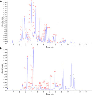 Metabolite profiling in the negative ion mode identified distinct chemical components in TZTMF and TZTMF-containing serum. A total of 78 compounds were identified in TZTMF (Table 2), comprising 24 flavonoids, 9 quinones, 19 phenolic acids, 8 terpenoids, and several other constituents. In TZTMF-containing serum (Table 3), 39 components were detected, including 10 flavonoids, 6 quinones, 12 phenolic acids, 1 terpenoid, and other minor compounds. The total ion chromatograms (TICs) of TZTMF and TZTMF-containing serum obtained by UPLC-ESI-MS/MS are presented in Figure 1, demonstrating the comprehensive qualitative and quantitative analysis of the metabolites.