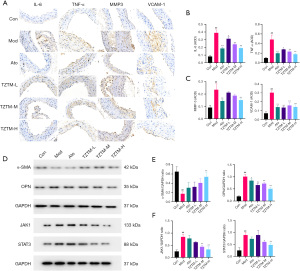 To investigate the molecular mechanism by which TZTMF regulates smooth muscle cell phenotypic transformation, JAK1 and STAT3 protein expression in the aortic tissues of ApoE−/− mice was analyzed using Western blotting. The results demonstrated that TZTMF treatment markedly attenuated the HFD-induced upregulation of JAK1 and STAT3 proteins in the aorta (Figure 3D,3F).
