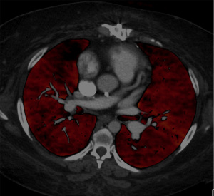 DECT has revolutionized the imaging of CTEPH over the last decade. Using differences in iodine attenuation over different kilovoltages, DECT allows quantification of iodine within a voxel of lung tissue, termed as “perfused blood volume (PBV)”. Studies have shown PBV to be a good surrogate marker of lung perfusion (18). By allowing assessment of anatomic and perfusion information on a single scan, DECT has emerged as one of the frontline tools for assessment of CTEPH. Several studies have shown that perfusion information from DECT correlates with hemodynamic parameters and can help in prediction of post-operative outcomes (19-21). Qualitative assessment of PBV images can help identify areas of PSP and potentially identify patients with microvasculopathy (Figure 4). In a study 93 patients evaluated with DECT, pulmonary perfusion of blood volume in the normally perfused group showed an inverse correlation with PVR, while that of patients in the poorly perfused group did not. Patients with PSP on DECT had a lower diffusing capacity of the lungs for carbon monoxide (DLCO), which might be the strongest predictor of microvasculopathy including diffuse distal thrombosis (22,23). Another study demonstrated that PSP was present in 51% of patients with CTEPH, although this finding improved after BPA. Quantitative assessment of DECT-based vascular parameters might further insights into the presence of SVD, although data is lacking (24).
