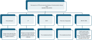 CTEPH, chronic thromboembolic pulmonary hypertension; CTPA, computed tomography pulmonary angiography; DECT, dual-energy computed tomography; FDG, fluorodeoxyglucose; GGO, ground-glass opacity; MRI, magnetic resonance imaging; PC-MRI, phase-contrast magnetic resonance imaging; PET, positron emission tomography; SVD, small vessel disease; V/Q, ventilation-perfusion.