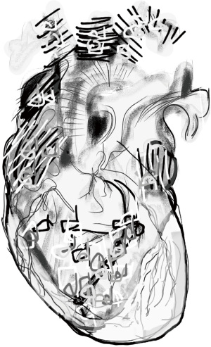 This artwork (Figure 1) presents a visual metaphor for contemporary cardiology, situated at the intersection of organic vitality and digital analysis. The foundation of the piece is an expressive, monochromatic sketch of the anatomical human heart, rendered with raw, dynamic strokes. The deliberate absence of color strips the organ of its literal, physiological fleshiness, likening the image to a scan from advanced diagnostic machinery.