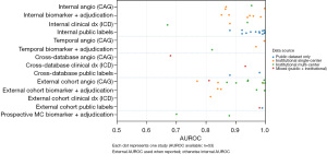 Most studies used retrospective designs (n=80, 91%), while eight studies (9%) were prospective. Most investigations relied on 12-lead ECG configurations (n=64, 73%), though single-lead approaches designed for wearable devices were investigated in six studies, and intermediate configurations including 8-lead and 4-lead systems were evaluated in several investigations. Across model families, AUROC, sensitivity, and specificity analyses showed wide overlap with no consistent superiority; given substantial between-study heterogeneity and mixed validation types, direct statistical comparisons were not performed (Figure 3). To facilitate cross-study interpretation of AUROC in the setting of substantial heterogeneity, we stratified results by validation setting, reference standard, and data source, in addition to model family (Figure 4).