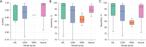 Hybrid architectures combining CNN-RNN, CFW, or ensemble approaches were explored in 18 studies (20%). These models theoretically offer advantages by integrating spatial feature extraction with temporal modeling or attention-based interpretability. However, they did not show consistent performance advantages despite increased complexity. Reported sensitivities (71.8–99.1%) and specificities (76.0–100.0%) overlapped substantially with pure CNN ranges. External validation was conducted in only 4 of 18 studies (22%), including cross-database testing or independent cohorts (23,27,33,39). The heterogeneity in hybrid approaches and absence of standardized comparative evaluations preclude definitive conclusions about whether architectural complexity yields clinically meaningful gains.