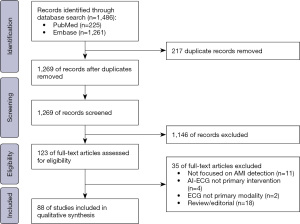 Studies were included if they met the following criteria: (I) original research articles published in English; (II) evaluation of AI or ML models for detection, diagnosis, or classification of AMI using ECG data; (III) utilization of human data, including both publicly available datasets and institutional patient cohorts; (IV) studies developing new AI models or evaluating the performance of existing models; and (V) reporting of quantitative performance metrics such as sensitivity, specificity, accuracy, or area under the receiver operating characteristic curve (AUROC). We excluded (I) review articles, editorials, commentaries, or conference abstracts without full-text availability; (II) studies using exclusively animal or simulated data; (III) studies focusing solely on other cardiac conditions without specific evaluation of myocardial infarction; and (IV) articles published in languages other than English.