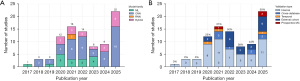 Publication volume increased markedly over time, from one study in 2017 to 22 studies in 2025 (Figure 2), with annual distribution by model architecture (Figure 2A) and validation setting (Figure 2B). Geographically, research was led by China (mainland) (n=22, 25%), followed by the United States (n=13, 15%) and South Korea (n=12, 14%), with additional contributions from Taiwan, India, Singapore, and multiple European nations.