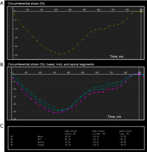 | Middle circumferential peak strain (%) | −22.08±2.83 | −20.48±3.89* | 0.003 |