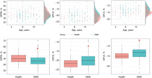 SPSS version 25.0 (IBM Corp., Armonk, NY, USA) and RStudio version 1.3.959 (Posit PBC, Boston, MA, USA) were used for analysis. The Kolmogorov–Smirnov test was used to test whether the parameters followed a normal distribution. The data are expressed as the mean and standard deviation (SD) or as the median and interquartile range (IQR). The Levene test was used to test the homogeneity of variance. The t-test was used when the parameters of patients with DMD and volunteers conformed to a normal distribution and the variance was homogeneous. When the sample size was small or the data were not normally distributed, the Mann-Whitney test was applied. Pearson correlation coefficient is used to analyze the correlation between two sets of continuous variables. A two-sided P value <0.05 was considered statistically significant.