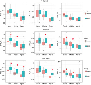 As shown in Table 2, there was no significant difference in age, body mass index, LVEF, left ventricular end-diastolic volume index, left ventricular mass index, left ventricular global, or regional strain between the 3- to 6-year-old patients with DMD (n=15) and healthy controls (n=21). Although there was no significant difference in age, BMI, left ventricular end-diastolic volume index, or left ventricular mass index between patients with DMD (n=63) and controls (n=18) at the age of 7–10 years, this age group of patents had significantly lower LVEF (59.58%±7.09% vs. 63.39%±5.27%, P=0.044) and left ventricular global radial (37.34%±9.78% vs. 42.95%±9.22%, P=0.03), circumferential (−20.75%±3.77% vs. −22.09%±2.46%, P=0.03), and longitudinal (−13.91%±2.81% vs. −15.69%±2.52%, P=0.04) strain; meanwhile, in terms of regional strain changes (Figure 4), this group had significantly lower parameters for the left ventricular basal segment, including radial (47.82%±13.63% vs. 60.08%±48.37%, P=0.045) and circumferential strain (−16.03%±2.78% vs. −18.31%±1.37%, P=0.004), as well as for the midventricular segment, including radial (36.24%±11.24% vs. 43.40%±11.63%, P=0.02), circumferential (−20.75%±3.37% vs. −22.65%±3.01%, P=0.03), and longitudinal (−12.48%±3.32% vs. −15.41%±2.77%; P=0.005) strain. There was no significant decrease in three components of the apical segment.