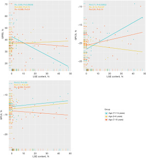 Figure 5 is a chart of the correlation between LGE content and global strain among the three components. We can observe that for the 11 to 14-year-old group, LGE content was strongly correlated with global peak radial strain (GPRS) (r=−0.69; P=0.001) and global peak circumferential strain (GPCS) (r=0.71; P<0.001). As LGE content increased, GPRS and GPCS in these patients decreased. Meanwhile, global peak longitudinal strain (GPLS) was not significantly correlated with LGE content.