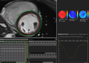 The patients with DMD and the controls were scanned with a 3.0-T MRI device (MAGNETOM Skyra, Siemens Healthineers, Erlangen, Germany). Participants with the following contraindications were also excluded: (I) ferromagnetic metal foreign bodies in the body; (II) claustrophobia, allergic constitution, or recent allergic diseases such as measles and allergic dermatitis; and (III) estimated glomerular filtration rate (eGFR) <30 mL/min/1.73 m2 (contraindication to gadolinium contrast agent). Patients and controls were given breathing training to facilitate the acquisition of images of good quality. Patients in a state of sleep were examined while they were breathing naturally. The head advanced scanning mode was adopted. The children were lying on the scan bed with an 18-channel body coil. The electrocardiogram electrode was connected, and the electrocardiogram-gated touch was used to send the acquisition signal. During the examination, an electrocardiogram and respiratory gating were used to observe participants’ condition. First, two-, three-, and four-chamber images of the heart were obtained via automatic scanning. Based on the image location, a balanced steady-state free precession sequence [repetition time (TR), 3.42 ms; echo time (TE), 1.48 ms; flip angle, 34°; slice thickness, 6 mm; field of view (FOV), 300×241 mm2; matrix size, 224×126] was used for cardiac cine imaging. The scanning range spanned the entirety of the left ventricle. A total of 11–12 short-axis and two- and four-chamber cardiac cine images were acquired simultaneously, with each layer containing 25 phases. Gadolinium-enhanced images were acquired in the same sections as the cine images 10 minutes after intravenous injection of 0.5 mmol/mL of gadopentetate dimeglumine (dose: 0.1 mL/kg body weight; flow rate: 1.0–2.0 mL/s; MultiHance, Bracco, Milan, Italy) with an inversion recovery true fast imaging with steady-state precession sequence (TR, 700 ms; TE, 1.31 ms; flip angle, 20°; FOV, 320×270 mm2; and slice thickness, 6 mm). None of the healthy controls underwent enhanced scanning.