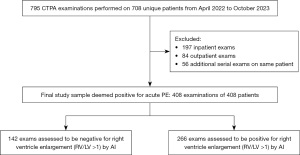 This retrospective study is Health Insurance Portability and Accountability Act (HIPAA) compliant and was approved by the institutional review board of the University of Texas Southwestern Medical Center (No. STU-2023-0769, on December 20, 2023). The study was conducted in accordance with the Declaration of Helsinki and its subsequent amendments. The requirement for written consent was waived. The investigation was conducted at a tertiary care university hospital. During the study period from April 2022 to October 2023, for purposes unrelated to this investigation, a Food and Drug Administration (FDA)-approved commercially available AI tool (BriefCase for PE, Aidoc) trained to detect acute PE on non-electrocardiogram (ECG) gated CTPA examinations was used to evaluate all contrast-enhanced chest CT examinations with PE protocol, the results of which were available to the radiologist. An automated measurement of RV/LV was also provided by a commercially available FDA-approved AI tool by the same vendor (14) when a positive acute PE was detected by the PE detection AI algorithm. The result of the automated measurement of the RV/LV was not available to the radiologist at the time of clinical interpretation. All results of the AI tool were stored in a departmental data warehouse for investigational purposes.