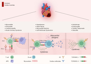 Immune checkpoint inhibitors (ICIs) activate the immune response by inhibiting immune checkpoints, thereby enhancing the ability of cytotoxic T cells to specifically recognize and kill tumor cells (1). However, because the mechanism of ICIs is not tumor-specific, their antitumor effects may also target normal tissues, leading to immune system overactivation and triggering a series of immune-related adverse events (irAEs). Among these irAEs, cardiac injury has attracted extensive clinical attention due to its potentially serious consequences. ICI-associated cardiac injuries include myocarditis, arrhythmia, vasculitis, thromboembolism, pulmonary hypertension, pericardial disease, Takotsubo syndrome, and left ventricular dysfunction (Figure 1) (2-6). Notably, ICI-related myocarditis has been reported to have the highest lethality among irAEs (7,8). Salem et al. reported a mortality rate of approximately 50% (5).