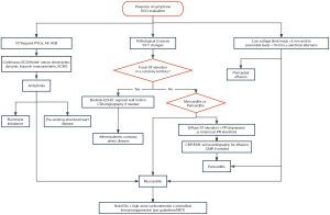 Second, pathological Q waves or ST-T segment abnormalities require further stratification. When ST-segment elevation is focal and corresponds to a specific coronary territory, bedside ECHO for regional wall-motion assessment and coronary computed tomography angiography (CTA) or invasive coronary angiography should be considered to support a diagnosis of atherosclerotic coronary artery disease. In contrast, when ST-T changes are diffuse or non-territorial, differentiation between myocarditis and pericarditis is necessary.