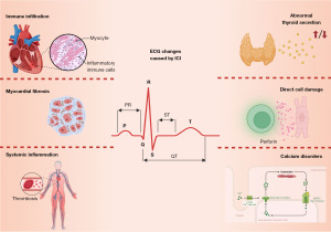 There are several mechanisms of electrocardiographic changes associated with cardiac injury caused by ICIs (Figure 2).