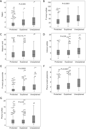 In 2018, we reported that plasma levels of trimethylamine N-oxide (TMAO), p-cresyl sulfate and two other metabolites were significantly higher in patients with unexplained atherosclerosis than in patients whose atherosclerosis was explained in linear regression by traditional risk factors (“explained”), and significantly lower in patients with little or no plaque despite high levels of traditional risk factors (“protected”) (20) (Figures 2,3). In linear regression, both TMAO p-cresyl sulfate were significant predictors of plaque burden, in a backward regression model in which sex, diabetes, serum cholesterol and diastolic blood pressure were excluded from the model.