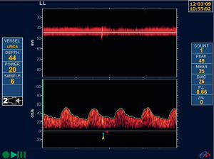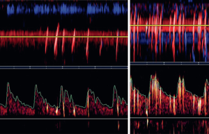 Although a right-to-left shunt (RLS) on transesophageal echocardiography (TEE) is regarded as the gold standard for diagnosing PFO, TCD saline studies are more sensitive for detection of PFO, and the size of the RLS as assessed by TCD is more predictive of recurrent stroke than the mere presence of an RLS on TEE. Figure 5 shows TCD saline studies in patients with PFO. Anzola discussed reasons why TCD is more sensitive than TEE for detection of PFO (45). These included the orientation of the caval ostium in the right atrium, the persistence of a Eustachian valve, the relative eccentricity of ostium primum and ostium secundum, and the anatomy of supra-aortic vessels.