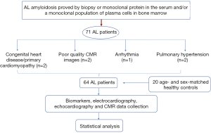 This study was approved by our institutional review board. We retrospectively considered 71 consecutive AL patients (34 females and 37 males, mean age 59±10.2 years old, range 25–81 years old) who had CMR examinations from 1 October 2014 through 31 March 2017. As Jaccard et al. (23) previously described, the diagnosis of amyloidosis was made based on a biopsy of subcutaneous fat or an involved organ with the demonstration of typical Conge red birefringence under polarized light. Amyloidosis was further confirmed by the detection of a monoclonal protein in the serum or urine and/or a monoclonal population of plasma cells in the bone marrow. The exclusion criteria were as follows: (I) patients with congenital heart disease, primary cardiomyopathy such as hypertrophic cardiomyopathy or coronary artery disease (n=1); (II) patients with poor quality CMR images (n=2); (III) patients with arrhythmia (n=2); and (IV) patients with pulmonary hypertension (n=2). Finally, the study group consisted of 64 patients (28 females and 36 males, mean age 58±12.8 years old, range 25–81 years old). Patients selection flow diagram shows in Figure 1. According to A Consensus Opinion From the 10th International Symposium on Amyloid and Amyloidosis, CA was defined as an LV thickness >12 mm without another known cause, as shown by echocardiography (24). A total of twenty age- and sex-matched healthy controls (8 females and 12 males, mean age 54±12.1 years old, range 24–75 years old) were enrolled as the normal control group. None of the included individuals had a history of heart diseases, systemic hypertension, or diabetes.