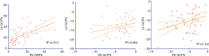 For the strain analysis, RV-GRPS, RV-GLPS, and RV-GCPS were significantly lower in AL patients than in controls (P<0.001 for all comparisons). Most importantly, RV-GRPS (8.5±1.04 vs. 20.3±2.12, P<0.001) and RV-GLPS (−2.7±1.17 vs. −5.33±0.64, P=0.03) were lower in patients with reduced RVEF than in those with preserved RVEF (P=0.02). As shown in Table 1, there was no significant difference in RV-GCPS between patients with preserved or reduced RVEF (1.06±1.63 vs. −2.12±0.88, P=0.15). In addition, a Pearson’s correlation test indicated that there was a good correlation between RV-GRPS and LV-GRPS (r=0.56, P=0.001) and a moderate correlation between RV-GLPS and RV-LVGLPS (r=0.32, P=0.015) (Figure 3).