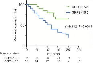 During a mean follow-up period of 15 months, there were 37 (58%) deaths among all 64 included AL patients. Ten deaths occurred within 5 months of the AL amyloidosis diagnosis, 21 occurred within 10 months, 33 occurred within 15 months and 37 occurred within 20 months. Tables 4 and 5 reports the univariate and multivariate analyses of AL patients with various clinical and CMR parameters. In the univariate analysis, log NT-proBNP, log troponin T, Mayo stage, RV-LGE, RV-GRPS, RV-GLPS, LVEF, LV-GRPS, LV-GCPS and LV-GLPS were significantly (P<0.05) related to survival. In the multivariate analysis of RV parameters and Mayo stage, only RV-GRPS (HR =0.93, 95% CI, 0.88–0.98, P=0.007) and Mayo stage (HR =3.11, 95% CI: 1.30–7.41, P=0.01) remined strong predictors of mortality. In the multivariate analysis of RV and LV parameters, only RV-GRPS (HR =0.92, 95% CI: 0.87–0.97, P=0.004) remined a strong predictor of mortality. As shown in Figure 4, patients with lower RV-GRPS had a significantly poorer prognosis than was found in those with higher RV-GRPS, based on the median CMR strain values (15.5%) for GRPS (10 vs. 20 months, HR =0.93, 95% CI: 0.87–0.98, log-rank test =9.712, P=0.002).